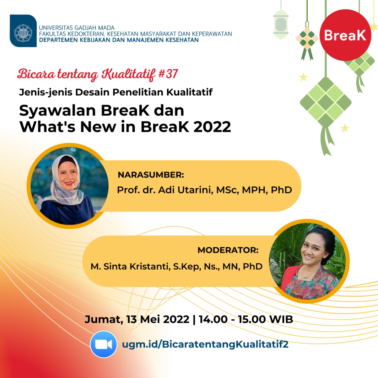 Departemen Kebijakan dan Manajemen Kesehatan FK-KMK UGM, bermaksud menyelenggarakan acara mingguan BreaK (Bicara tentang Kualitatif) yang dilaksanakan via daring melalui aplikasi Zoom pada: