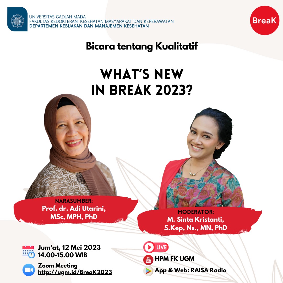 BreaK #52 Salam Sehat, Bapak/Ibu sobat BreaK… Departemen Kebijakan dan Manajemen Kesehatan FK-KMK UGM menyelenggarakan acara mingguan BreaK (Bicara tentang Kualitatif) yang dilaksanakan via daring melalui aplikasi Zoom pada: 📆 […]