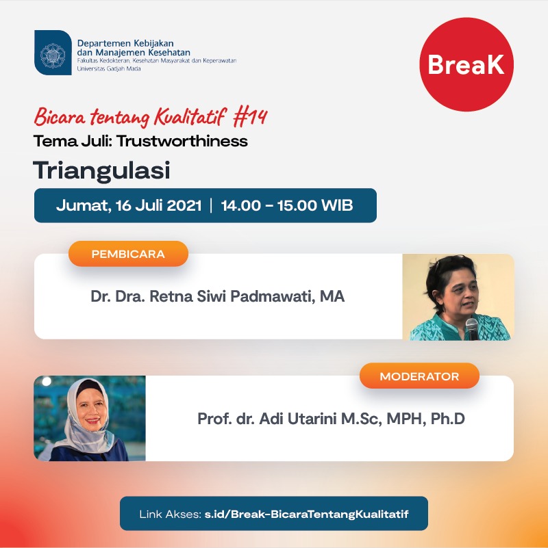Break #14 Salam Sehat, Bapak/Ibu sobat BreaK… Departemen Kebijakan dan Manajemen Kesehatan FK-KMK UGM, bermaksud menyelenggarakan acara mingguan BreaK (Bicara tentang Kualitatif) yang dilaksanakan via daring melalui aplikasi Zoom pada: […]