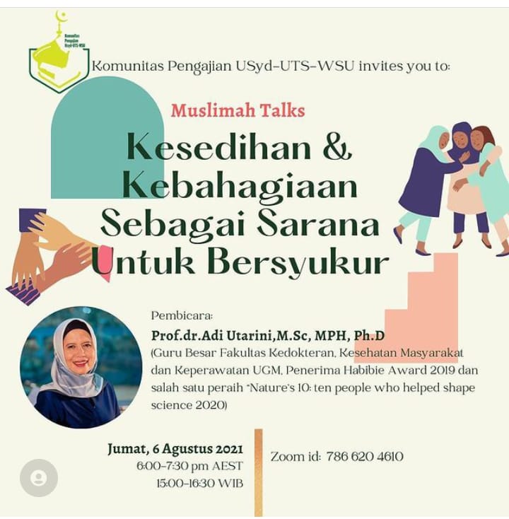Assalamu’alaykum wr.wb. Komunitas Pengajian USyd-UTS-WSU mengundang rekan2 Akhwat sekalian dalam acara bincang-bincang ”Muslimah Talks” dengan tema Kesedihan dan Kebahagiaan Sebagai Sarana Untuk Bersyukur dengan narasumber Prof.dr.Adi Utarini, M.Sc, MPH, PhD, […]