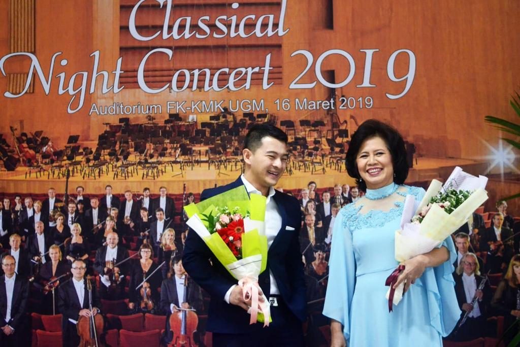 Prof Adi Utarini dan dr Jodi Visnu MPH setelah performa membawakan lagu Setitik Embun (Mochtar Embut) dan Wanita (Ismail Marzuki). Prof Uut juga menampilkan Rachmaninoff Variation 16, Rhapsody from a theme of Paganini bersama Medical Chamber Orchestra. Classical Night Concert: Beautiful Symphony, FK-KMK UGM, 16 Maret 2019.