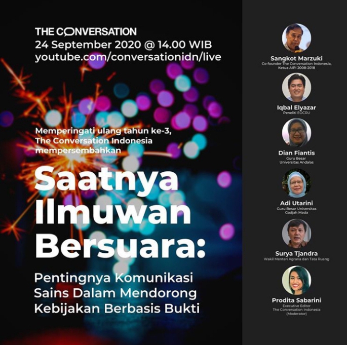 Ilmuwan Indonesia memiliki kepakaran untuk memberi rekomendasi kebijakan pada pemerintah dan menjelaskan pada khalayak awam bagaimana menjaga keselamatan diri dan keluarga. The Conversation Indonesia, sebagai media online nirlaba, berkolaborasi dengan komunitas sains Indonesia untuk menjalankan misi menyebarkan pengetahuan dan memperkuat kebijakan.